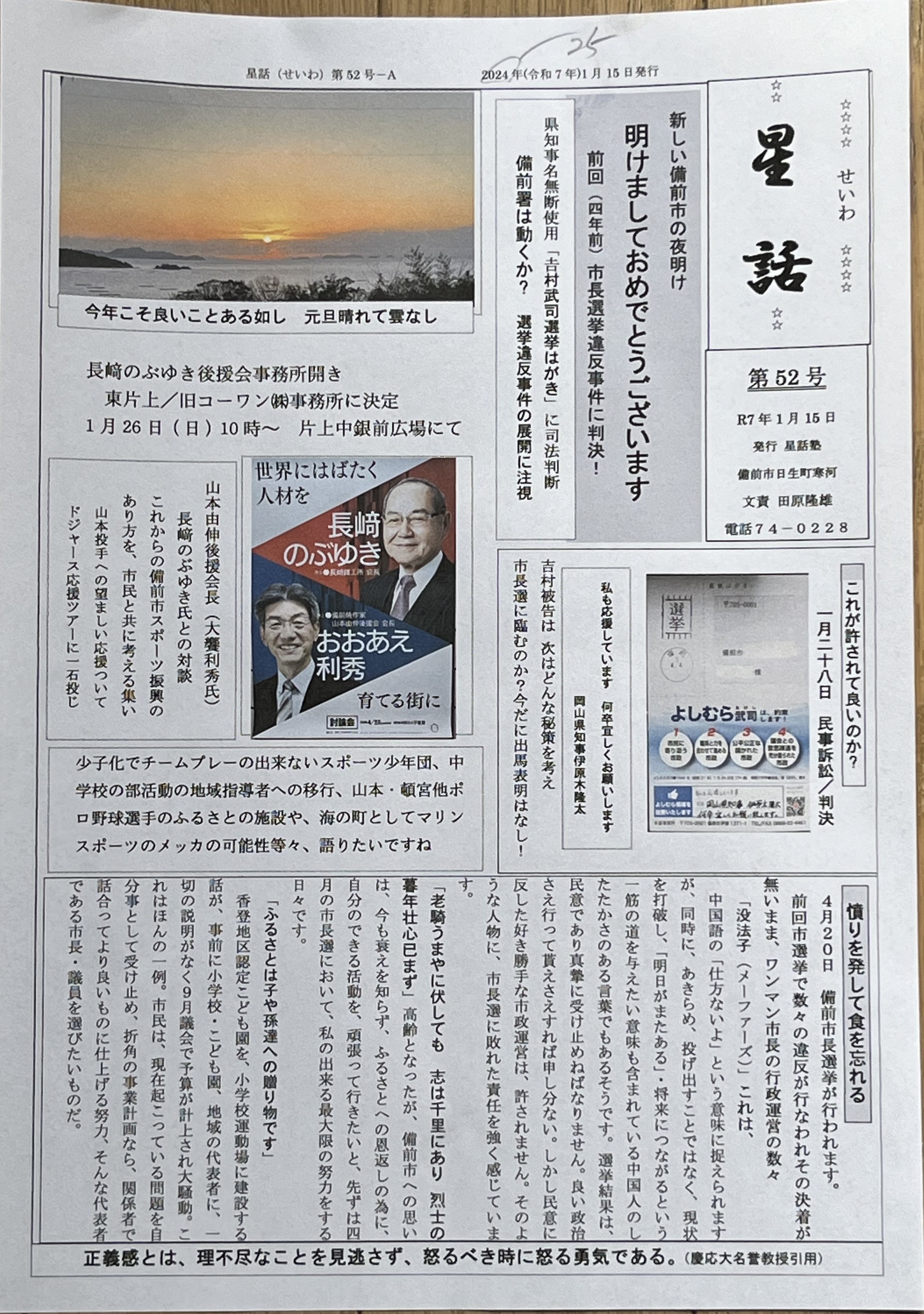 第11回 市長選挙-3 本年4月5日告示・12日投票の 備前市長選挙 選挙にはデマ中傷は、つきもの 「選挙は手段! 町をよくする事が目的だ!」 みんなで真実を語ろう 市道日生・頭島線第2期じぎょうとは! |