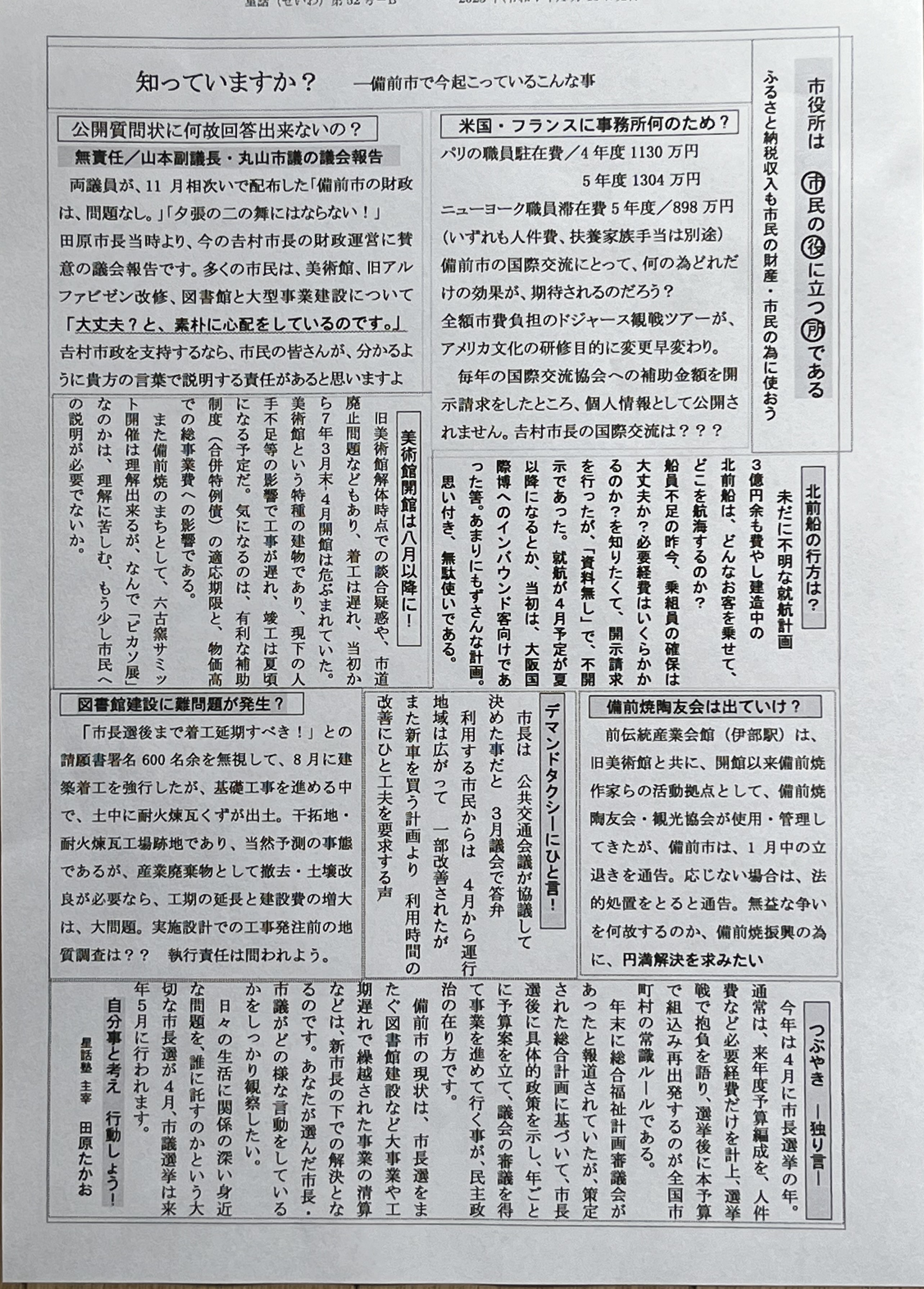 私自身も、田原市政1期目を総括し、市民の皆さんの声を聞かせて頂く時機と、考えておりますが、「市民に寄り添い市民とともに…。」